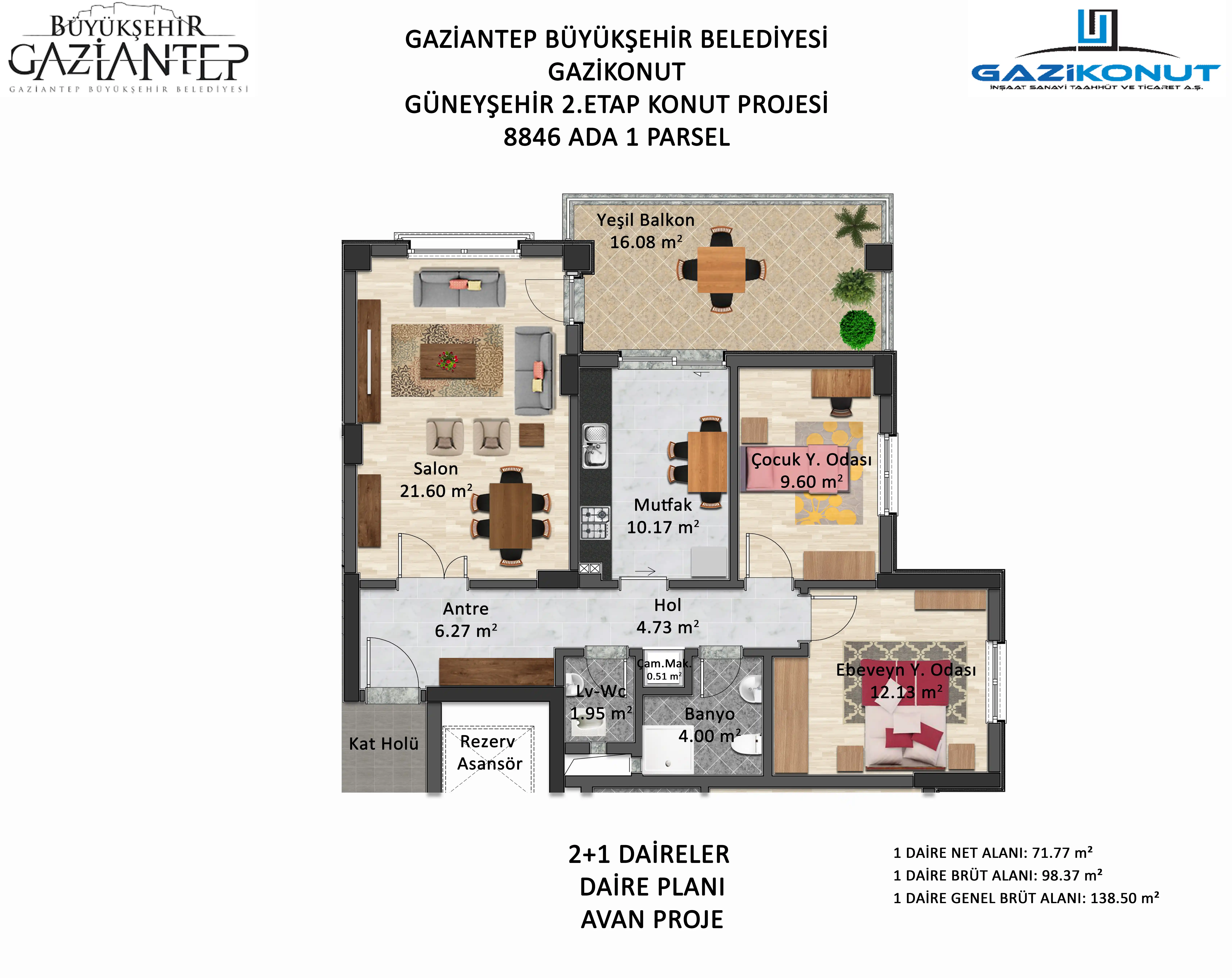 sonra 2+1 tipi konut için 102 adet, 3+1 konut için 97 adet yedek
